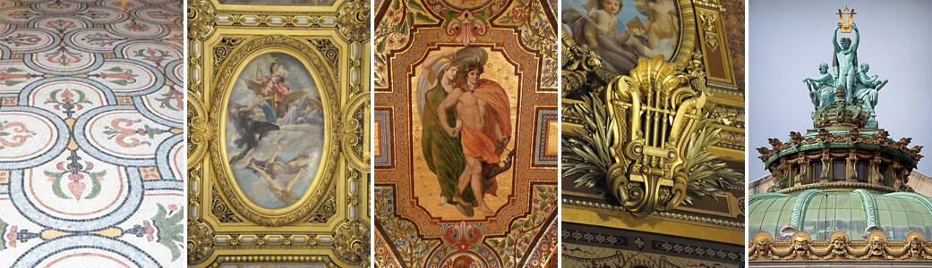 The motif I created for the cover of the book and the chapter dividers were inspired by the mosaic flooring. The design for the quote pages were inspired by the ceiling of the Grand Foyer. The title page was inspired by the paneled ceiling of the Avant-Foyer. And Apollo's lyre can be found throughout the book design just as it is found repeated throughout the architecture of the Palais Garnier.